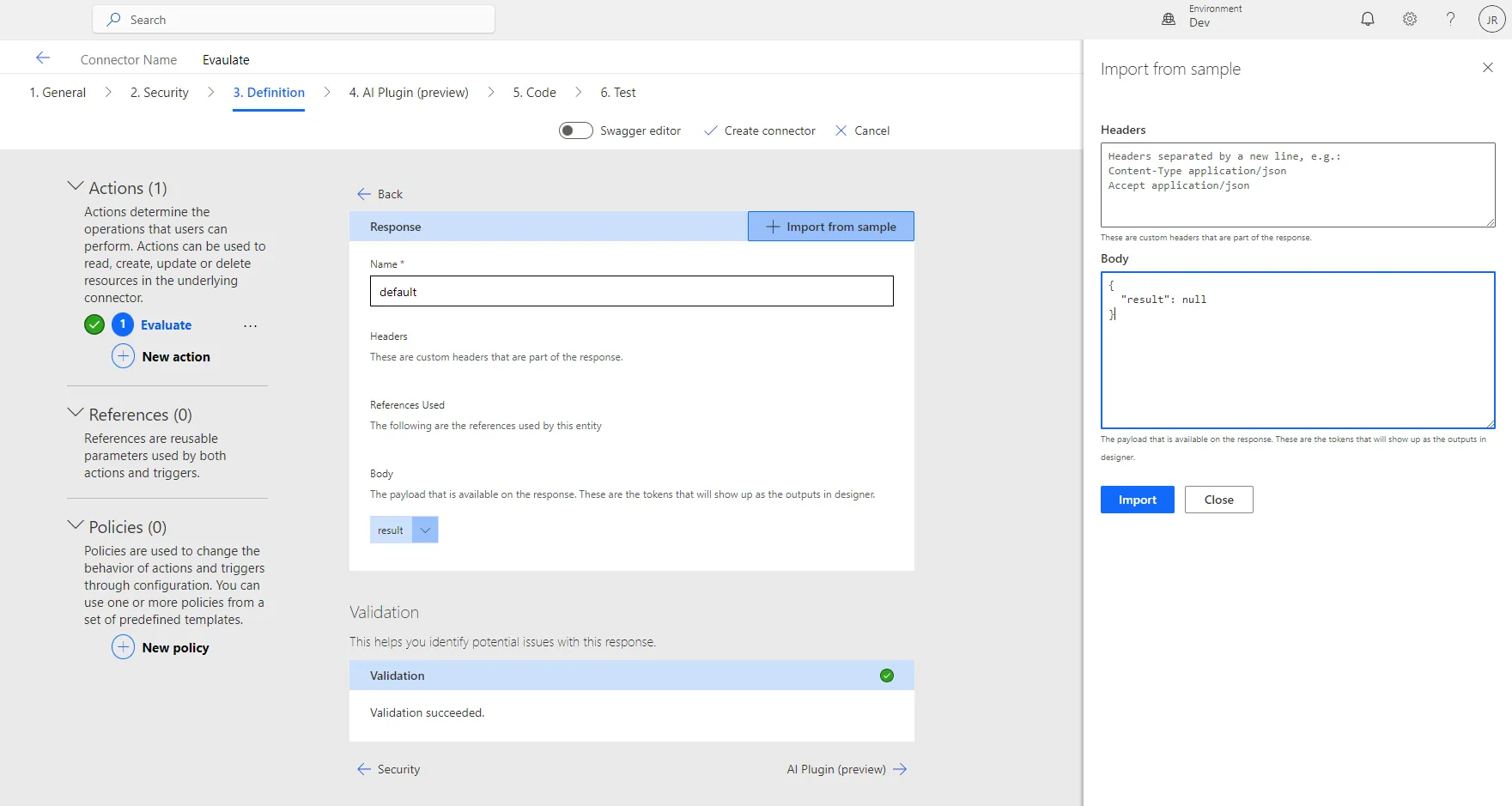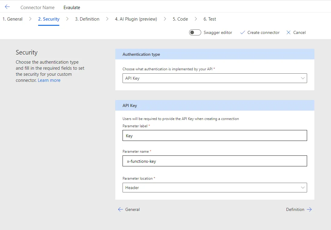 - Navigate to “Data” > “Custom connectors” > “New custom connector” > “Create from blank”.